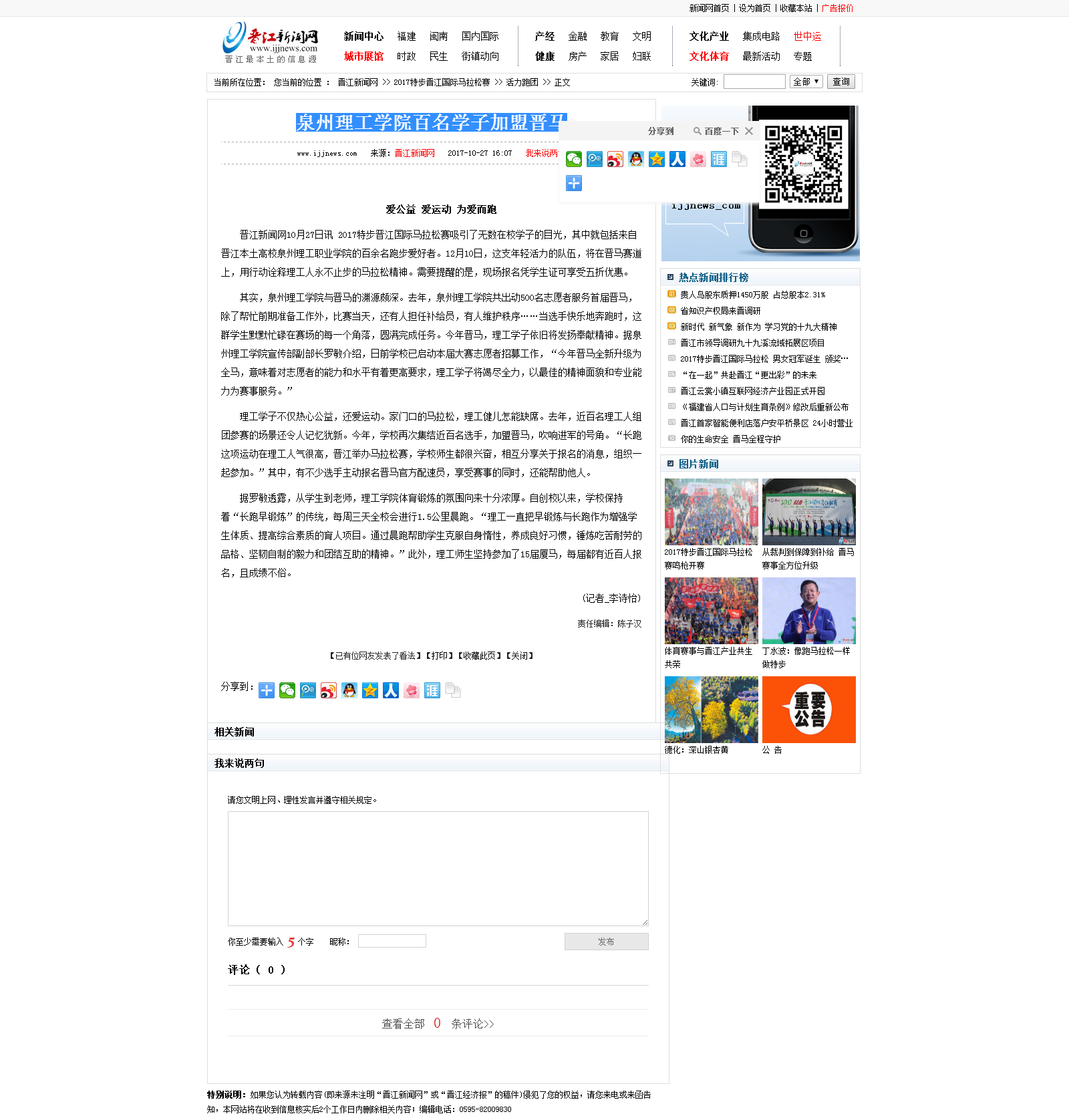 泉州理工学院百名学子加盟晋马 爱公益 爱运动 为爱而跑 晋江新闻网10月27日讯 2017特步晋江国际马拉松赛吸引了无数在校学子的目光,其中就包括来自晋江本土高校泉州理工职业学院的百余名跑步爱好者。...