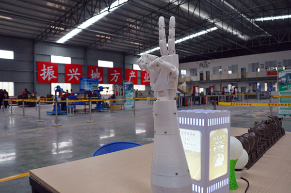 在智能制造中心3D打印区,几台3D设备正忙碌着,发出“嗞…嗞…嗞”的打印声。在展区“龙首、虎首、马首”……十二件仿制的“国宝”十二生肖兽首整齐排列着,栩栩如生。创意台灯,一通电,灯光将浮雕照片中的人、物照亮,美观精致。仿真机械臂,活灵活现,运动自如……