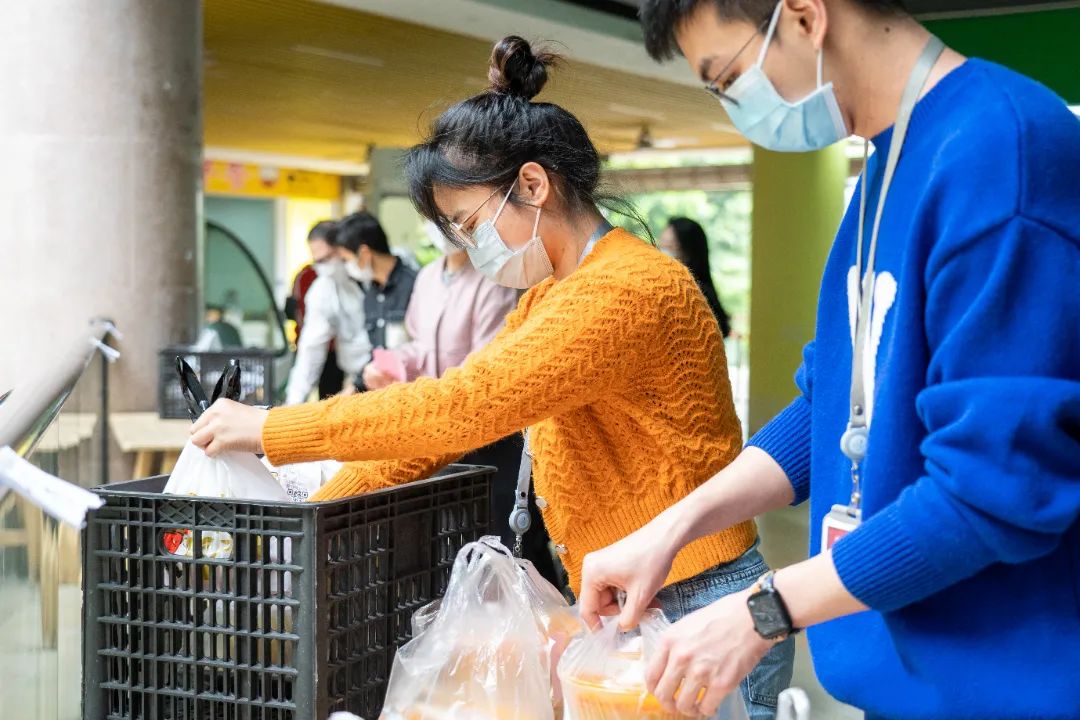 接收、分类、装箱,再一件件抬上电瓶车运到各个书院分发……3月21日,校领导、教职工、教工家属纷纷加入抗疫教职工志愿服务队中,共出动近百人次,为全校学生提供送餐服务,全力保障学生们的用餐。