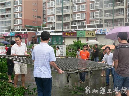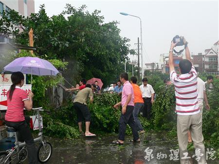 由于本次台风来势凶猛,降雨量大,导致学校部分广告牌被台风刮坏、车棚倒塌、部分树木被连根拔起、校园内严重积水、学校北渠道路堵塞。发现险情后,学校领导召开了自然灾害防御工作应急会议,成立抗灾领导小组,对学校的受灾情况进行全面巡查、评估,立即启动应急措施,组织力量进行灾后抢险和抢修工作。在校领导的带领下全校师生众志成城投入到紧张的抢修工作中