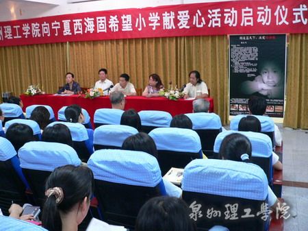 泉州理工学院向宁夏西海固希望小学献爱心活动启动仪式514号下午在校学术报告厅举行。本次活动由06级财经系人力资源管理专业的同学发起倡议,校学工处组织开展,以“节约一元钱,奉献一份爱”为口号,全校师生纷纷捐款捐物,用自己滚烫的爱心向西部贫固地区儿童捎去“六一”节日礼物。