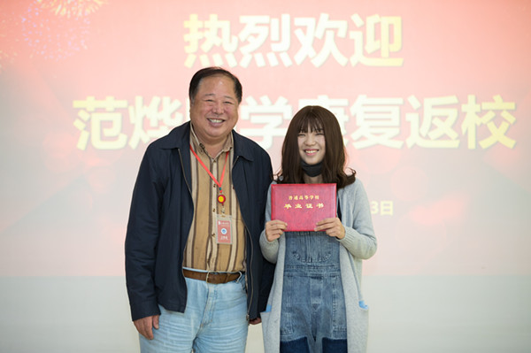 2016年7月,范烨在北京市人民医院接受了骨髓移植手术,手术很成功,范烨康复出院。带着感恩,范烨与爸爸妈妈一同回到学校,从臧树良校长手中接过红彤彤的毕业证书。为感恩母校,范烨给学校送来了锦旗,并写了感谢信,她以最直接,最淳朴的方式,感谢着曾经给予她帮助的老师、同学们。