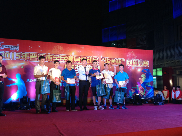 11 10 日,晋江市 2015 年全民健身运动会 华逸杯 网球比赛颁奖典礼在宝龙广场隆重举行。晋江市副市长史思泉、晋江市文体新局书记陈茂和、晋江市青商会副会长蔡小强等出席仪式,我校董事长吴金营以及其他参赛运动员参加颁奖典礼。