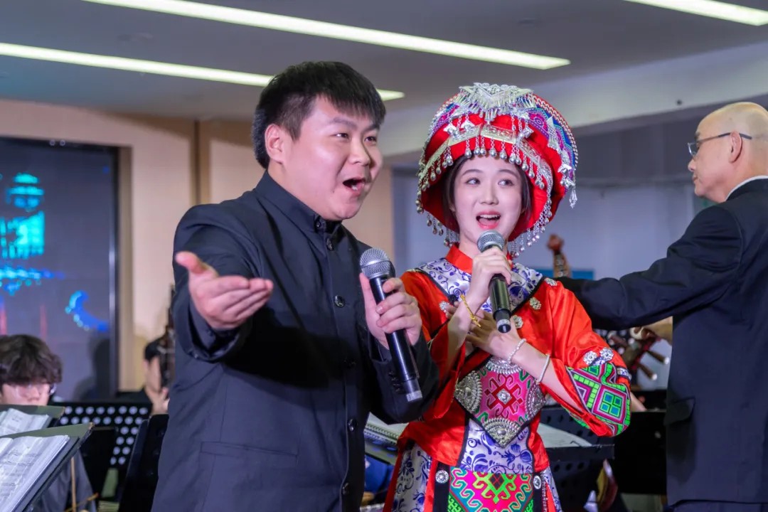 铿锵有力、气势磅礴的民乐响起,一曲《金蛇狂舞》拉开了音乐会的序幕。这是聂耳于1934年根据民间乐曲《倒八板》整理改编的一首民族管弦乐曲,奠定了音乐会昂扬的基调和欢腾气氛。