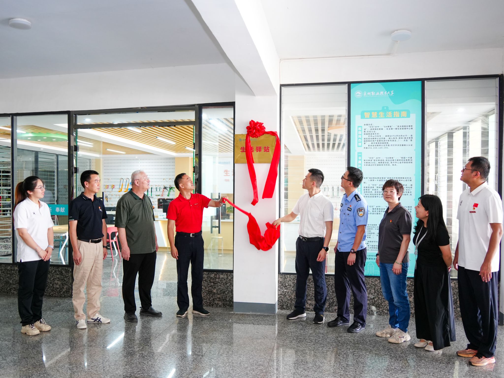 ▲ 校党委书记傅志雄,内坑镇党委政法委员、副镇长丁诗铃共同为泉州职业技术大学一站式学生社区综合服务中心、生活驿站揭牌