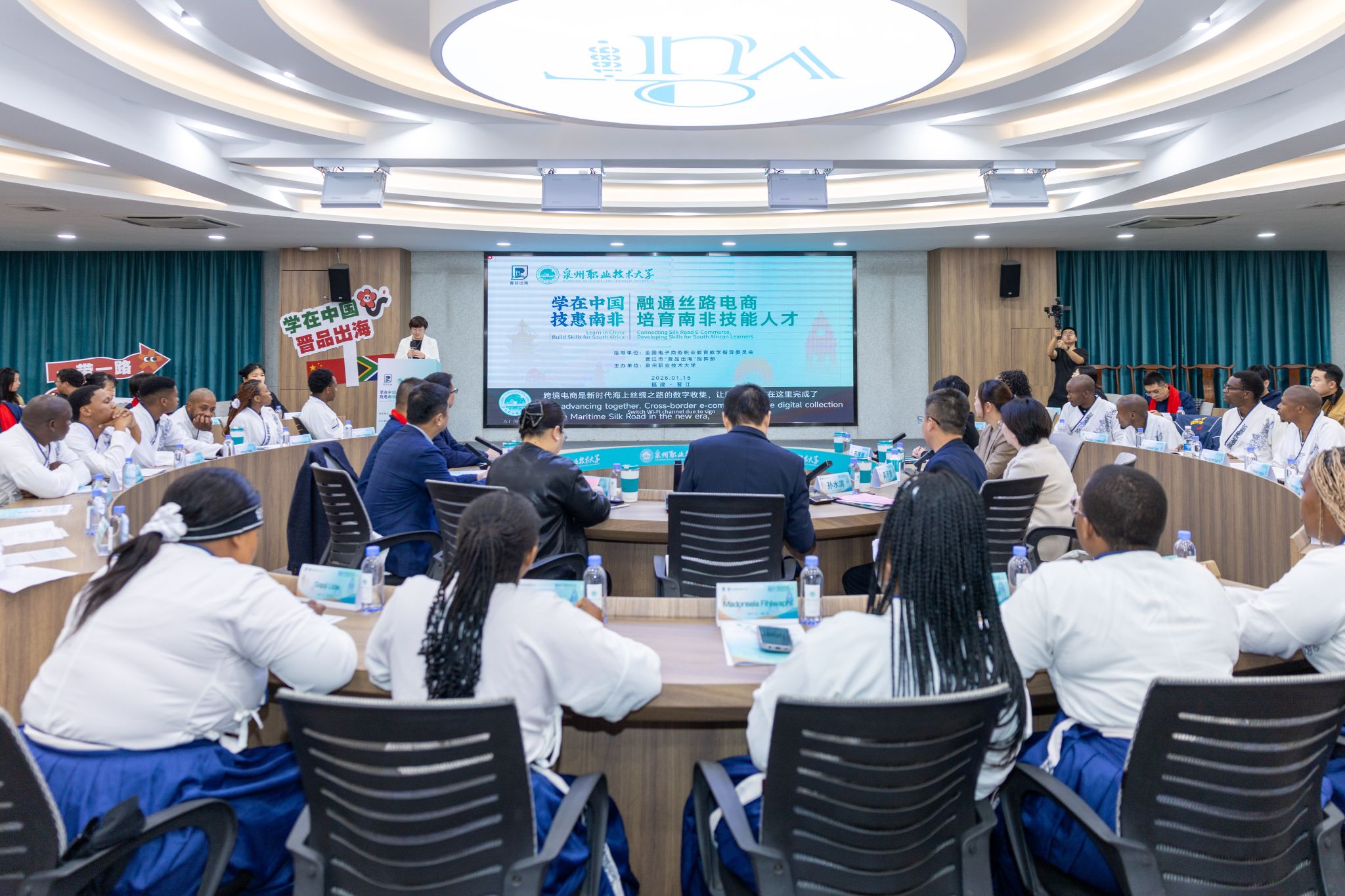 她介绍,学校接到“学在中国”计划南非跨境电商技能专训班项目时,迅速成立十几个部门参与的工作专班,与各级政府、晋品出海指挥部、行业协会、头部企业紧密沟通,为学员的到来做了充分准备。培训将构建理论学习、实训演练、项目实战、文化体验“四位一体”的人才培养体系,并邀请平台公司培训师、行业专家、企业负责人参与教学。她对学员们提出三点希望,要珍惜机会学真本领、广交挚友链接资源、牢记安全平安研学。学校计划学员学成归国时将成立南非校友会,让这份中南情谊得以延续。