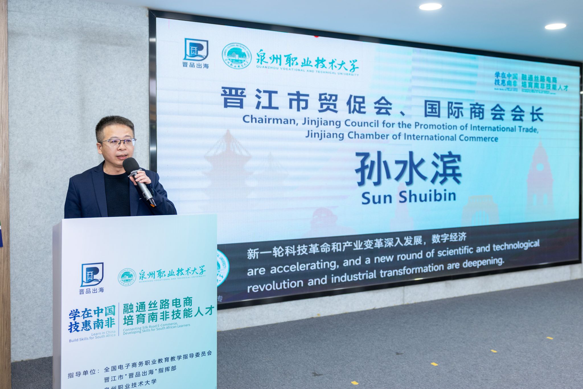 受晋江市“晋品出海”指挥部领导委托,孙水滨在致辞中向远道而来的南非青年才俊表示诚挚欢迎。他生动阐释了“晋品出海”战略的深刻内涵,“晋品出海”出的不仅是物美价优的产品,更是享誉世界的品牌;出的不仅是产业的优势,更是文化的自信。在数字经济时代,“晋品出海”依靠的是以跨境电商为代表的“数字丝绸之路”,这让“家门口”变成“出海口”成为现实。