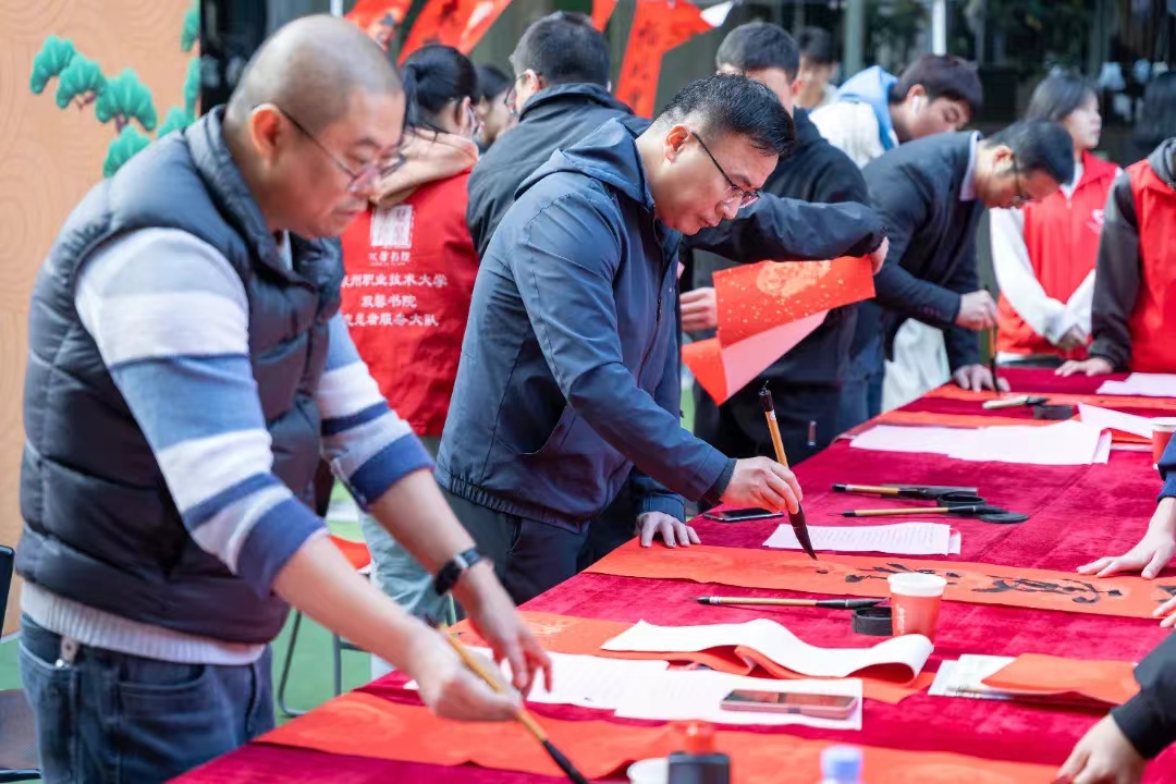 为进一步提升资助育人成效,弘扬中华优秀传统文化,新春佳节来临之际,泉州职业技术大学举行“龙行龘龘 墨香泉大”送春联活动。邀请中国书法家协会、福建省书法家协会的几位书法家和学校师生们一同书写、现场赠送,为泉大师生献上了吉祥喜庆的春联。他们命笔挥毫,一撇一捺之间,将新春祝福深深地融在了一张张联纸上,整个校园瞬间溢满了浓浓的墨香。