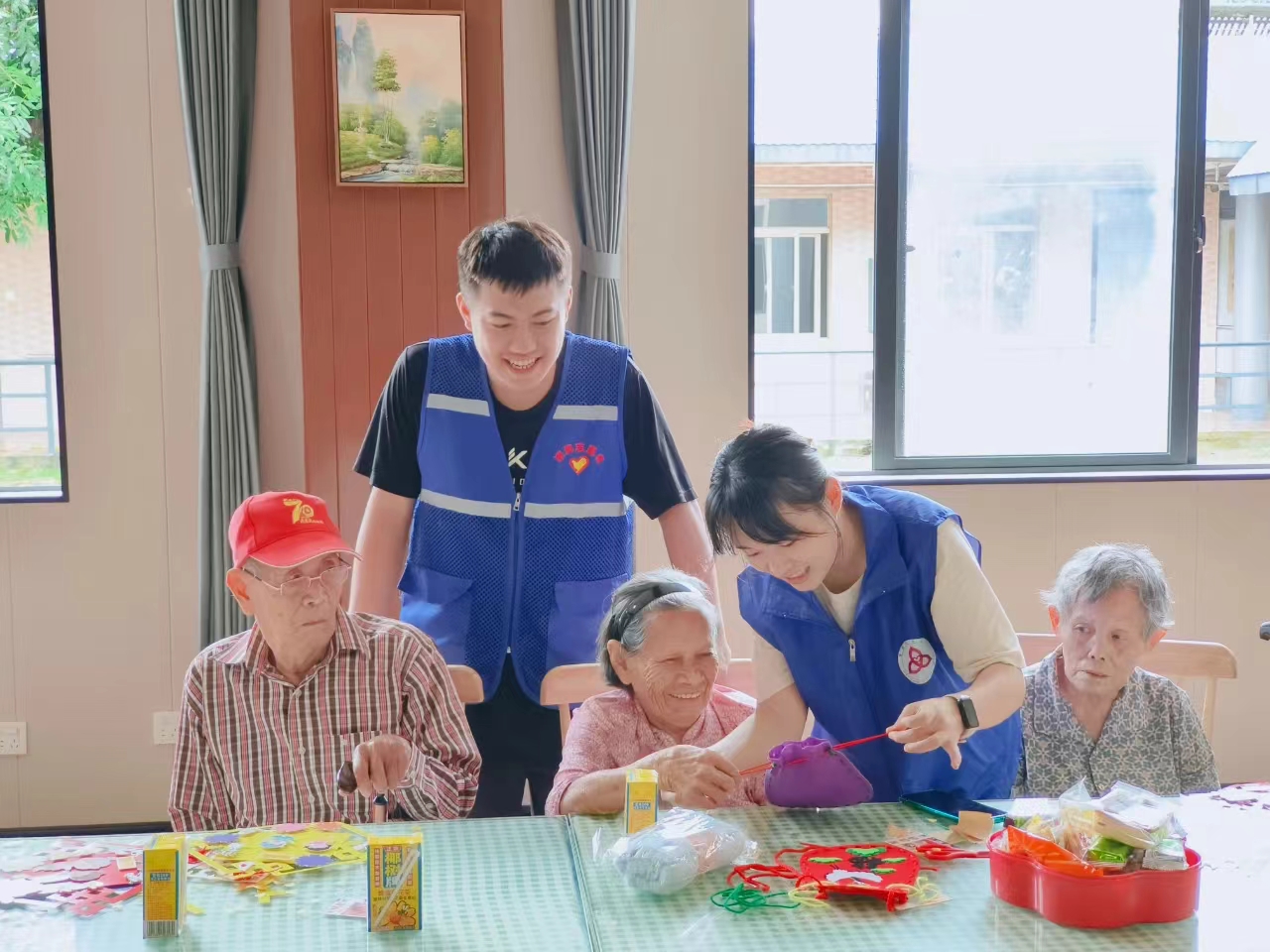 ▲2023年10月23日,海南省琼海市博鳌镇社工站开展“情暖金秋,爱在重阳”敬老月主题活动。图为社工、志愿者和博鳌社会福利中心的长者们一起制作手工福袋。