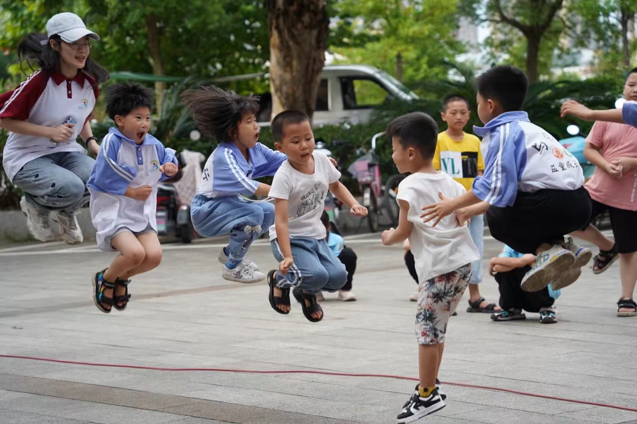 ▲2022年7月22日,福建宁化,宁化县葛藤凹社会工作服务中心社工组织困境儿童开展“与邻童行·益童成长”暑期夏令营,促进儿童的人际交往和社会化。图为孩子们与大学生志愿者一起玩趣味体能游戏,大家乐在其中。