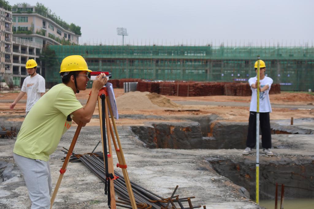 在泉大,同学们很喜欢金教授的《测量学实习》课程。每年夏天,他的实践课程,同学们都非常积极。烈日下,虽然大家备受考验,每天在工地与灰尘、泥土为伴,但是,他们却深深喜欢着这堂课。实践课上,有紧张、有压力、更有忙碌。每天一大早,他们带上测量工具就往工地里赶,有的同学甚至顾不上洗漱,只用毛巾简单擦把脸就匆匆出门。他们在工地上忙碌,用双脚和仪器展开测量,工地里几乎每个角落都留下同学们的脚印,“有时一忙碌,连一口水都忘记喝。”