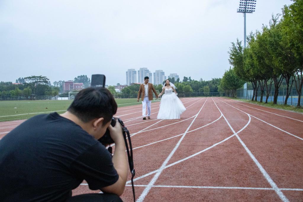 这一天,天上飘着蒙蒙细雨,校园里到处湿漉漉的。他们风雨无阻,按约定来到校园。“前两次,因为疫情等原因,迟迟不能来学校拍照。这是第三次了,我们不能再错过机会。”新郎伸出手感受细雨,他说,校园是他们相遇、相识的起点,婚纱照如果没有这里的风景,他们会感到很遗憾,即使冒雨也要赶来学校。拍照行程紧,回到母校,他们也很匆忙。新郎忙前忙后,一会给新娘递水,一会帮她提婚纱的裙摆。看着他满头大汗,新娘不时拿纸巾帮他擦拭。