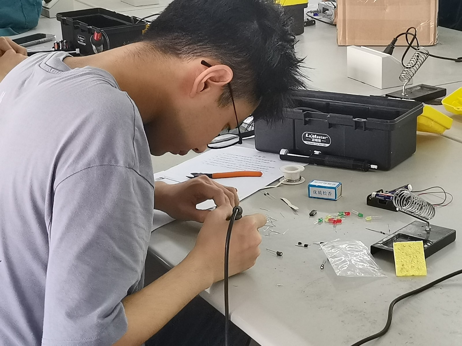 此次竞赛共有17位同学参加,每人都配有一份套件和工具,根据任务书要求的7个步骤,结合套件说明书,进行认真仔细的电路制作。