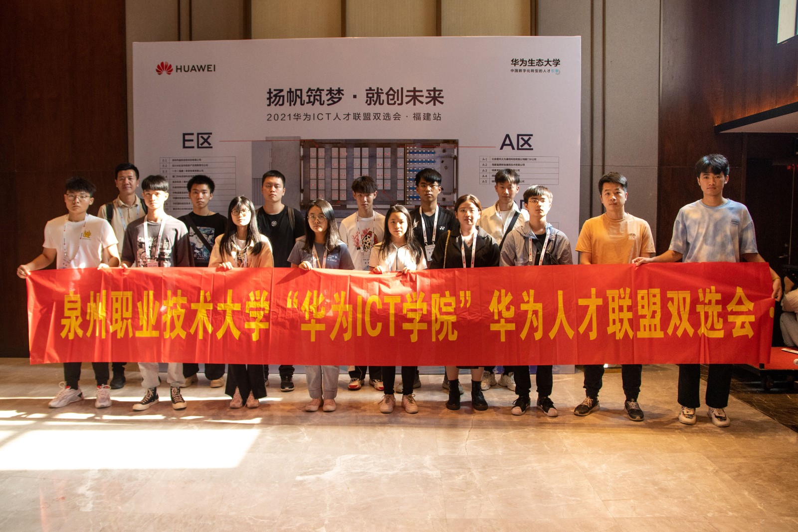 4月24日当天,由我校智能制造学院-华为ICT学院副院长林江鸿带队,协同计算机应用工程专业学业辅导员傅培琴、潘晓虹、国科科技泉州教育基地负责人张进京,带领19级、20级11名学生代表前往福州参与此次华为ICT人才联盟双选会。